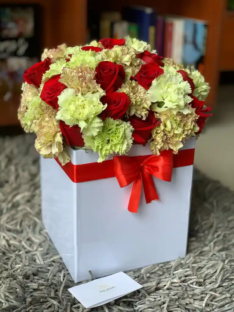 -24 rosas -Claveles -Recipiente de lujo -Cintas de tela -Tarjeta