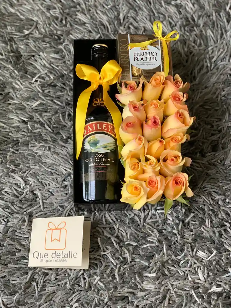 15 a 20 rosas -Ferrero Rocher 4 bombones -Baileys 700ml -Recipiente de lujo -Cinta de tela -Tarjeta