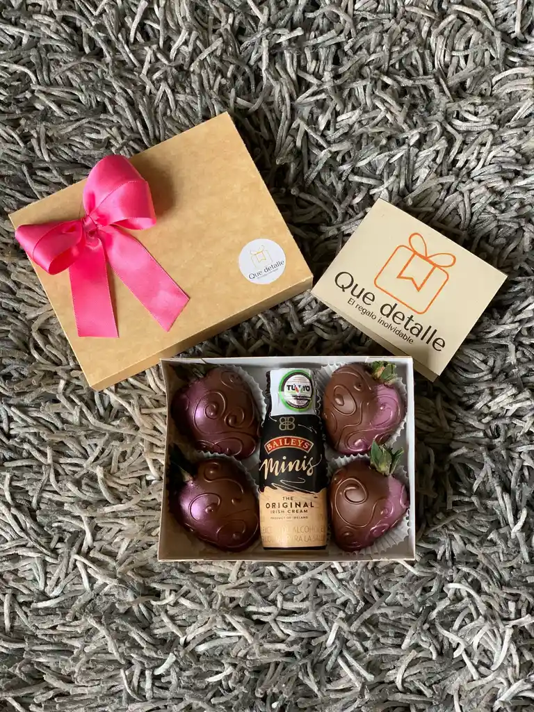 -4 fresas jumbo -Baileys 100ml -Caja de cartón -Moño en Cinta de tela -Tarjeta