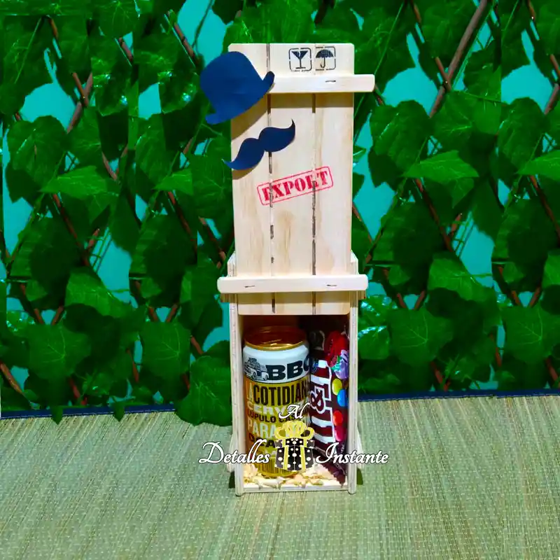 Productos 1 Cerveza BBC en lata 1 chocolates M&M's Accesorios 1 Tarjeta con mensaje impreso 2 Toping de cartulina, bigote y sombrero Empaque 1 Guacal pequeño con tapa deslizable Aserrín decorativo