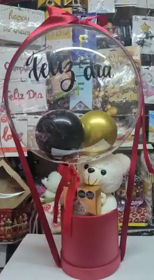 detalle box burbija contiene globo burbuja con sticker feliz dia caja fina redonda color roja diametro de 14cm 15 cm de altura peluche de 20cm aproximadamente ferrero x 4 unidades