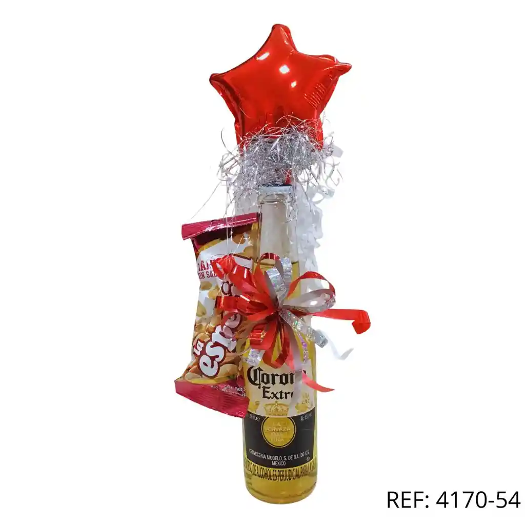 Detalle con cerveza Corona Extra 330ML acompañada de maní, globo estrella y moño decorativo. Un regalo refrescante y especial.
