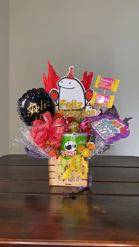 Contiene: base de madera, papitas pringles , 1 burbuja jet, 1 trululu piramidal, 2 jumbo mani, 1 bianchi, 1 globo metalizado, 2 pines decorarativos, 2 trululu aros, lazo.