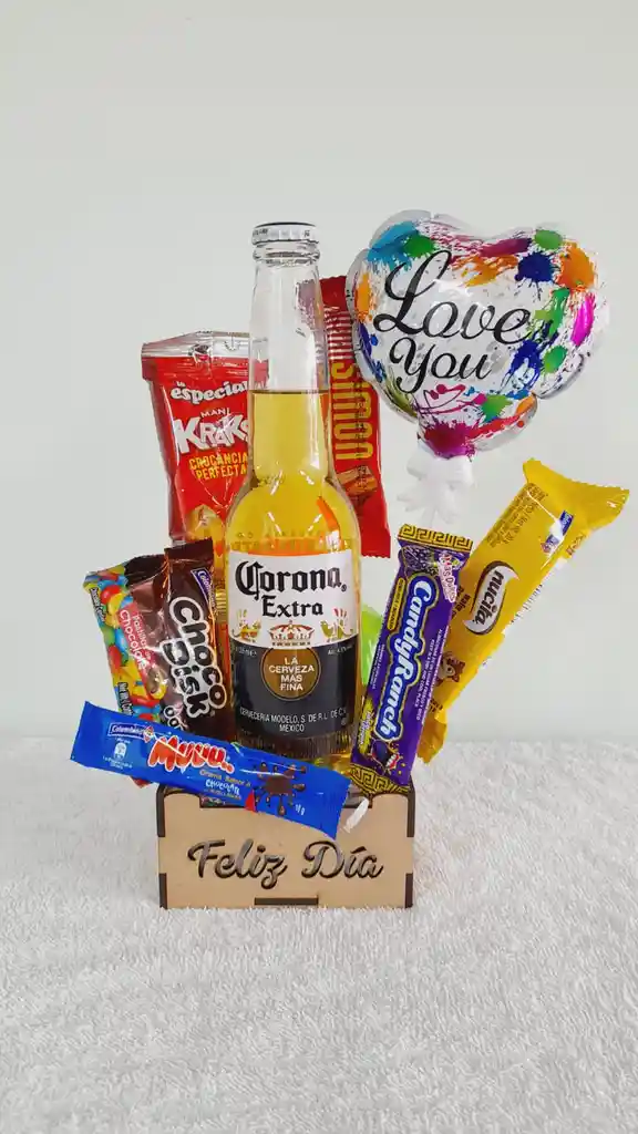 Detalle en caja decorativa, contiene Cerveza Corona, chocolates variados, Maní, Globo decorado