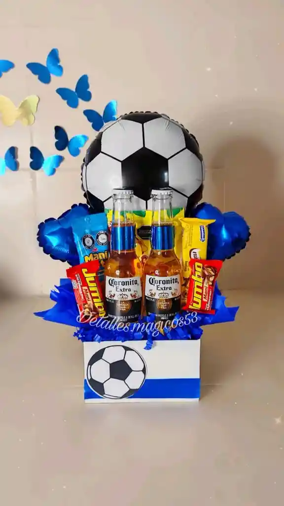 “Un detalle perfecto para los amantes del fútbol. Incluye globo temático de balón, cervezas, variedad de chocolates y snacks, todo en una base decorada con estilo futbolero. Ideal para sorprender en cumpleaños, celebraciones o cualquier ocasión especial a ese hincha apasionado. 🎁🍫🍺”