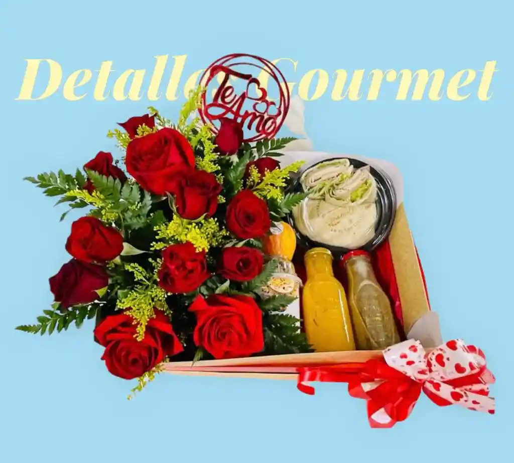 Delicioso detalle en caja decorativa que contiene ramo de rosas, Jugo de naranja, bebida de café capuchino, delicioso wrap de jamón y queso, Fruta, y bonyurt