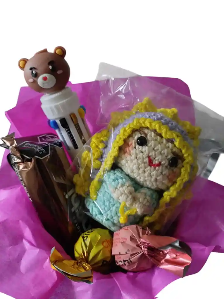 Lindo detalle virgen , Incluye : 1) Llavero de virgen Tejida a Crochet 100 % a mano 2) Lapicero Multi minas de osito 3) Vaso super mama 4) Barra Chocolatina Bianchi ( Chocolate blanco , leche o maní ) 5) 2 Mini Burbujas Bianchi Adicional papel seda decoración colores mujer.