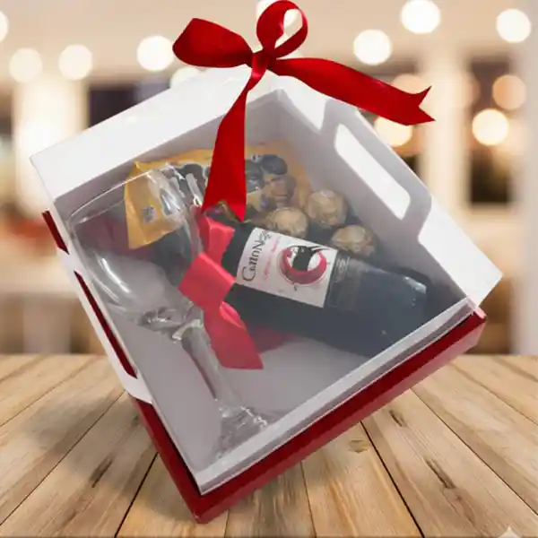 Detalle Luxury – Elegancia y Sabor 🍷🍫 El regalo perfecto para brindar por los momentos especiales con un toque de sofisticación. ¿Qué incluye este detalle? Vino: Botella de vino pequeño ideal para un brindis íntimo. Cristalería: Copa de vino elegante lista para usar. Chocolates Premium: Exquisitos bombones Ferrero Rocher. Toque Divertido: Una chocolatina M&M's para endulzar el paladar. Todo presentado en una caja de lujo con tapa transparente y un lazo decorativo que realza su exclusividad.