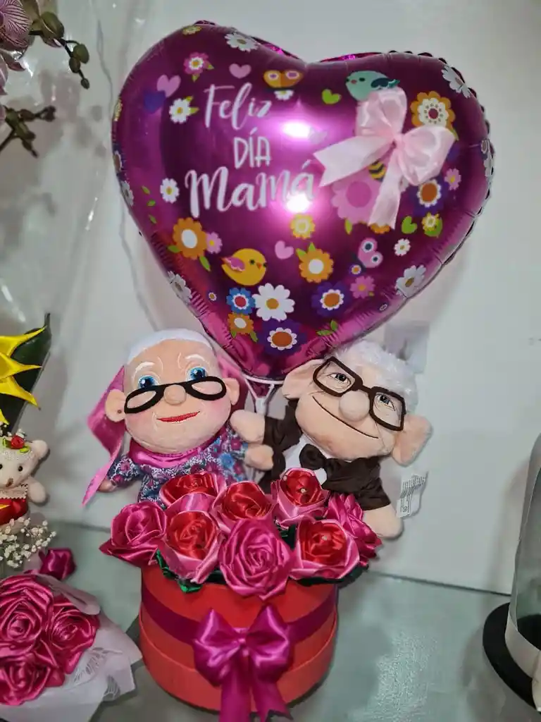 CAJA CON ROSAS ETERNAS MAS VIEJITOS UP INCLUYE GLOBO