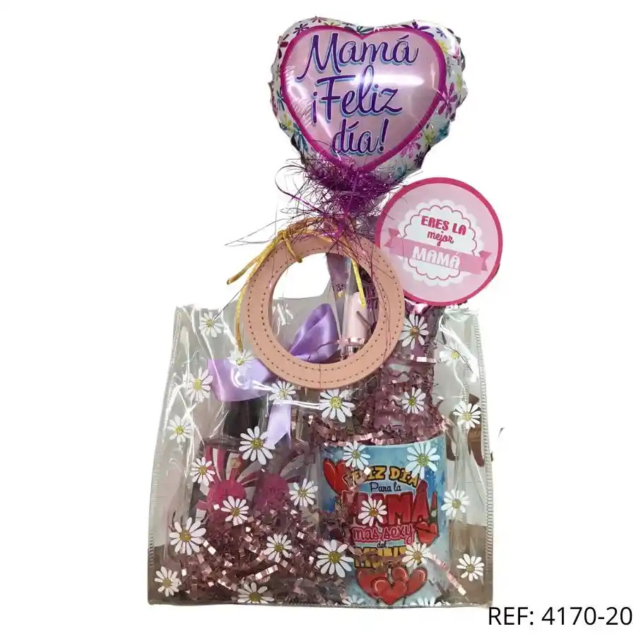 Set para mamá con splash, vaso decorado y globo metálico. Presentación en bolso transparente. ¡Un regalo lleno de amor!