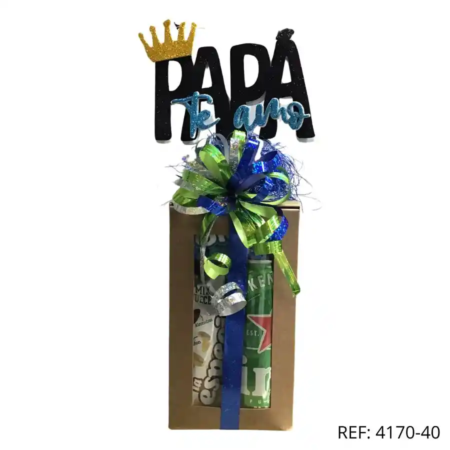 Caja con snacks y cerveza Heineken. Decoración elegante con mensaje: “Papá te amo”.