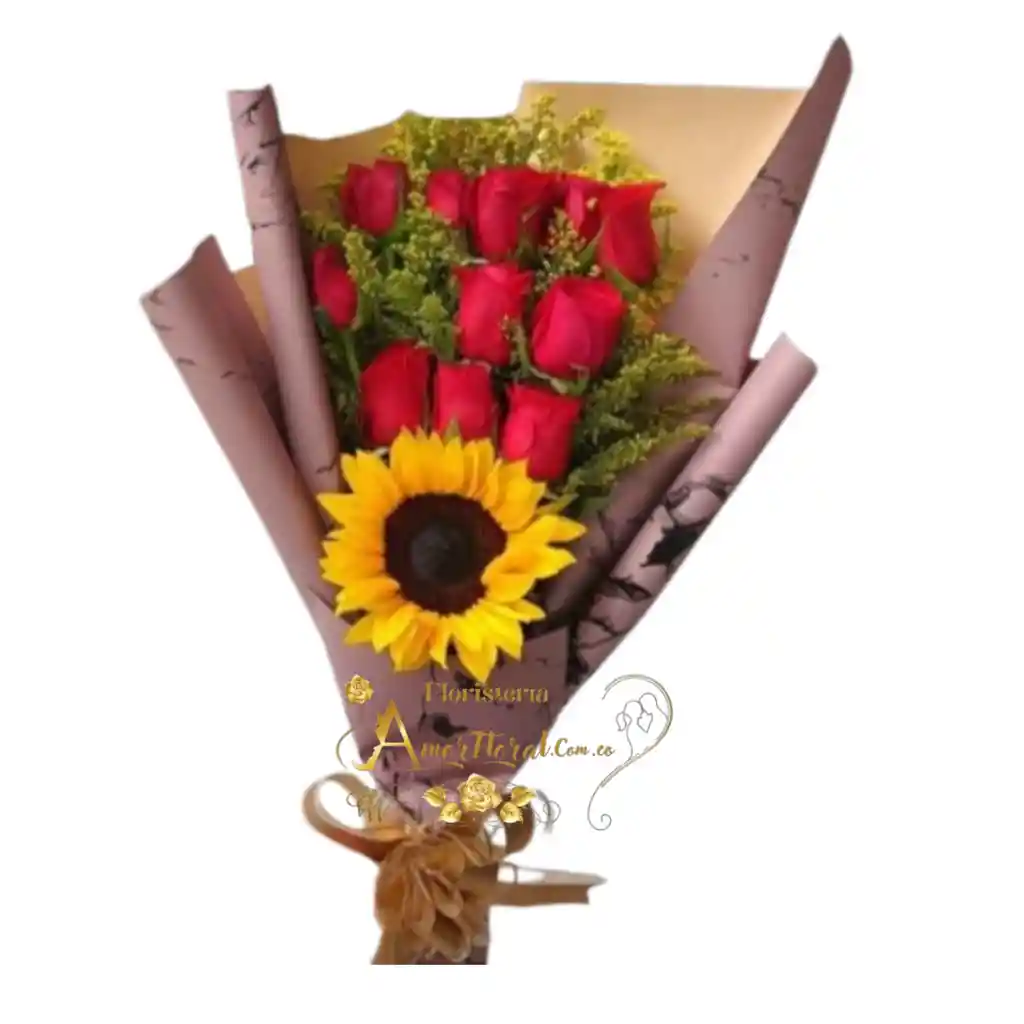bouquet por 12 rosas, 1 girasol, si deseas un mensaje para la tarjeta lo puedes dejar escrito en el área de observaciones o escribirnos al whatsapp al 3143111616 y enviarnos el mensaje para la tarjeta.