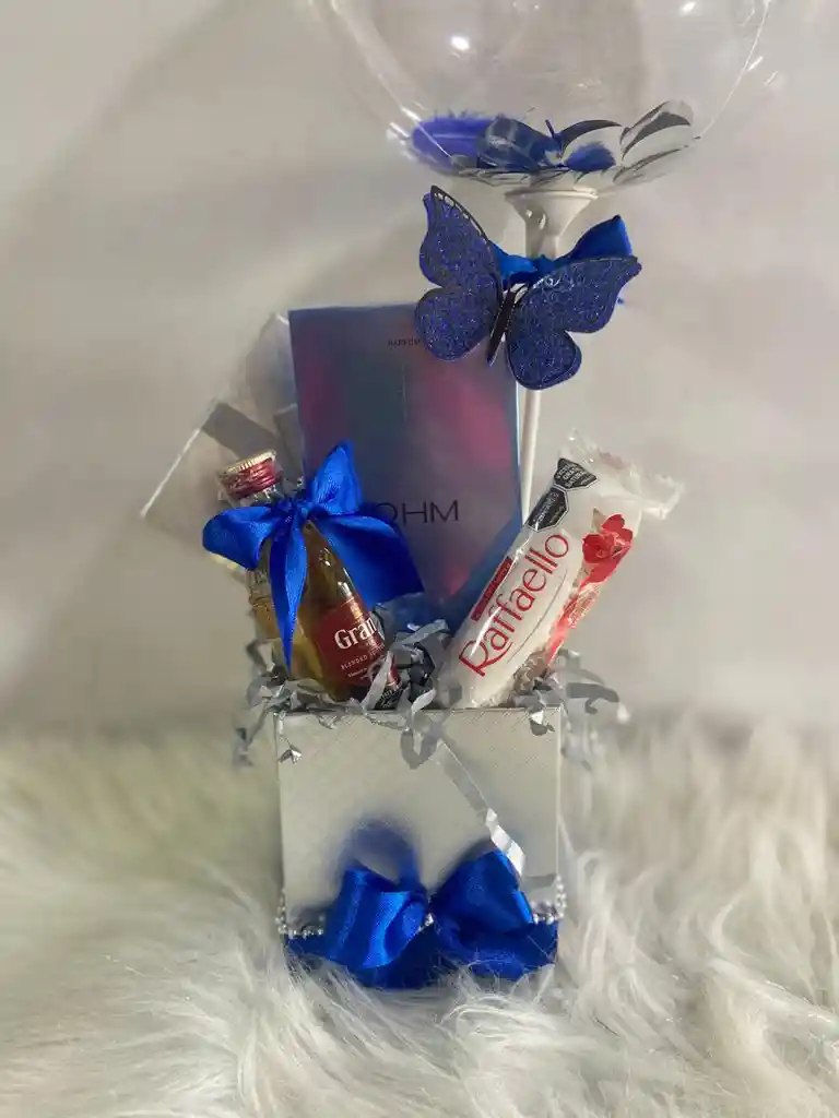 Detalle locion y vevida con un dulce y globo de color azul