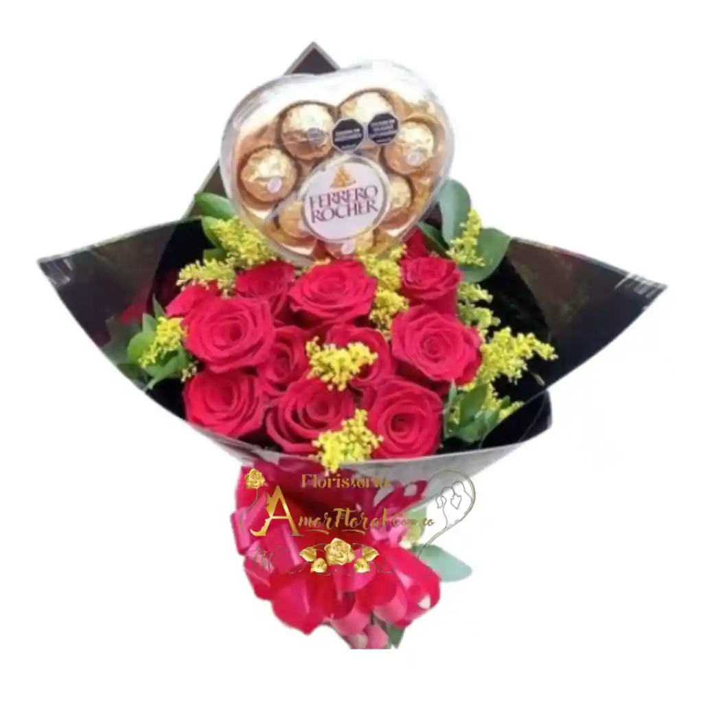 bouquet por 12 rosas, ferrero corazón, si deseas un mensaje para la tarjeta lo puedes dejar escrito en el área de observaciones o escribirnos al whatsapp al 3143111616 y enviarnos el mensaje para la tarjeta.