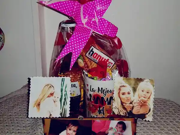 *Pocillo temático día de la madre. *Mensaje "Felicidades mamá" *Combo dulces (Trululus, chocobreaks y galletas). *Combo fotos. *Cajita de madera. *Cerveza importada. *Moño decorativo *Domicilio Incluido en cobertura