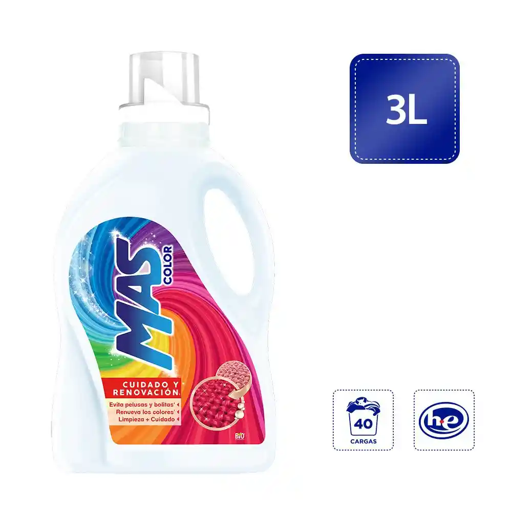 Devuélvele el color a tu ropa con MAS Color - Renueva los colores y repara las fibras de tu ropa en tan solo 10 lavadas - Actúa cuidadosamente sobre las fibras de tu ropa - Evita pelusas y motas ¡Olvídate de ropa decolorada, encogida o sin forma! Tu ropa como nueva una vez MAS.