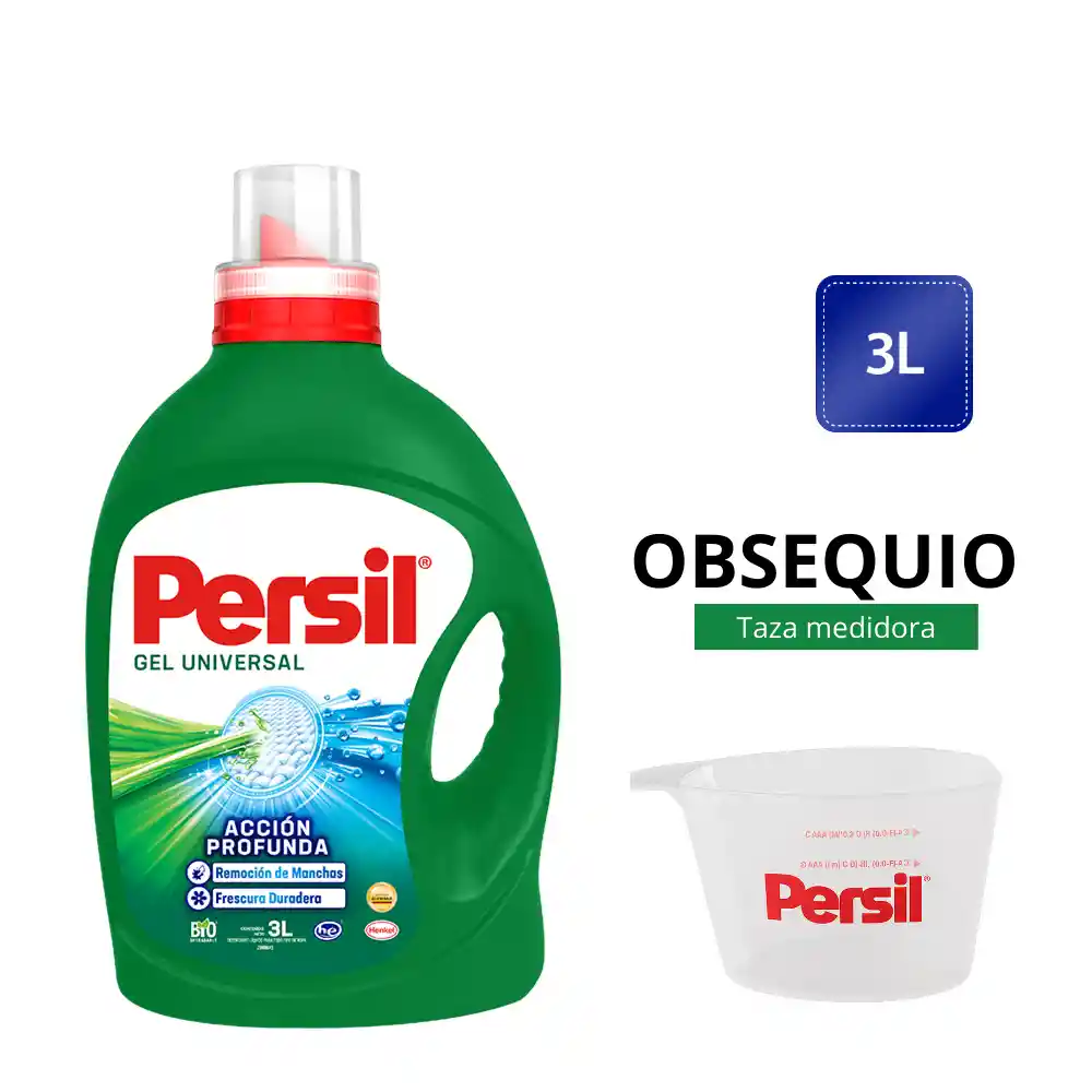 Con Persil la limpieza es total… ¡y ahora también precisa, con tu taza medidora de regalo! El Kit incluye: - Detergente Liquido Persil 3L - 1 Taza medidora ¡Para la dosis perfecta en cada lavado! Persil es el Nuevo Detergente #1 en Alemania que está ahora en Colombia. - Remueve hasta las manchas más difíciles como la de salsa, grasa, sudor, sangre y pasto. - Con tecnología Alemana que penetra las fibras profundamente asegurando resultados perfectos. - Combate los malos olores dejando la ropa con una frescura duradera. - Su fórmula es biodegradable. **Por tu compra recibirás 1 obsequio, tal como se muestra en la imagen. Aplica por pedido, no por cantidad de kits adquiridos**