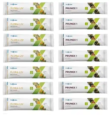 Este pack Detox combina dos poderosos productos Fuxion diseñados para limpiar el sistema digestivo de forma natural y efectiva en solo 7 días. 🔸 Prunex 1 (7 sobres): Suplemento a base de fibras naturales, frutas y plantas que favorecen la eliminación de toxinas, apoyan el tránsito intestinal y ayudan a depurar el colon suavemente. 🔸 Floraliv (7 sobres): Contiene probióticos y prebióticos que restauran la flora intestinal, mejoran la digestión, refuerzan el sistema inmune y ayudan a mantener un equilibrio digestivo saludable. 🌟 Beneficios principales: ✔️ Limpieza profunda del sistema digestivo ✔️ Reducción de inflamación abdominal ✔️ Mejora del tránsito intestinal ✔️ Restauración de la flora intestinal ✔️ Mayor energía y bienestar general PUNEX 1: ☕Toma un sobre en agua caliente. ⏱️Horario recomendado: Antes de acostarte a dormir FLORA LIV: 🍹Toma un sobre en agua fría ⏱️Horario recomendado: En ayunas o 40 minutos después de las comidas.