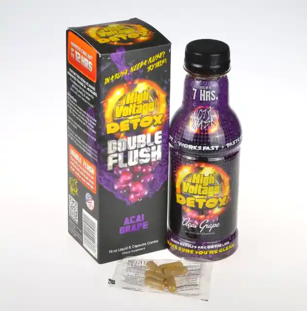 ¿Quieres nuestra limpieza de toxinas más potente? High Voltage Detox Double Flush fue diseñado pensando en la potencia. Esta combinación de desintoxicación líquida y en cápsulas fue diseñada para eliminar altos niveles de toxinas de su sistema. Efectivo en 2 horas y con una duración de hasta 12, este eliminador de toxinas es lo que necesita para las toxinas pesadas. Instrucciones de doble descarga de desintoxicación de alto voltaje: (proceso de 2 pasos) Consuma cápsulas de descarga rápida Detox de alto voltaje (todas) con 16 oz. de agua. Espere 30 minutos y beba otros 32 oz de agua. Espera una hora y bebe la Bebida Detox Premium High Voltage con 16oz. de agua. El producto comenzará a ser eficaz después de tres micciones de tamaño normal. Si tiene dificultad para orinar, aumente la ingesta de agua en 16 onzas por hora. La doble descarga de desintoxicación de alto voltaje permanecerá efectiva por hasta 12 horas. Para obtener resultados máximos: Evite las toxinas no deseadas durante 24-48 horas. Realice una limpieza previa la noche anterior bebiendo 10 vasos de agua de 8 onzas durante un período de 8 horas. Mientras usa este producto, orine con frecuencia para expulsar toxinas . No coma comidas copiosas ni consuma ningún alimento con cafeína o jugos de frutas durante el período previo a la limpieza. Evite medicamentos de venta libre o sin receta, alcohol, líquidos ácidos (como vinagre, jugo de pepinillos, café, etc.), vitaminas o alimentos salados. Beba mucha agua a diario.