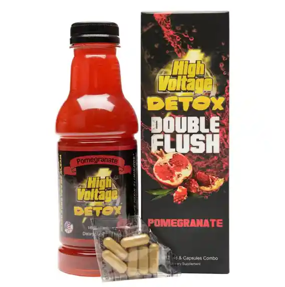 Detox High Voltage Double Flush pomegranate ¿Quieres nuestra limpieza de toxinas más potente? High Voltage Detox Double Flush fue diseñado pensando en la potencia. Esta combinación de desintoxicación líquida y en cápsulas fue diseñada para eliminar altos niveles de toxinas de su sistema. Efectivo en 2 horas y con una duración de hasta 12, este eliminador de toxinas es lo que necesita para las toxinas pesadas. Instrucciones de doble descarga de desintoxicación de alto voltaje: (proceso de 2 pasos) Consuma cápsulas de descarga rápida Detox de alto voltaje (todas) con 16 oz. de agua. Espere 30 minutos y beba otros 32 oz de agua. Espera una hora y bebe la Bebida Detox Premium High Voltage con 16oz. de agua. El producto comenzará a ser eficaz después de tres micciones de tamaño normal. Si tiene dificultad para orinar, aumente la ingesta de agua en 16 onzas por hora. La doble descarga de desintoxicación de alto voltaje permanecerá efectiva por hasta 12 horas. Para obtener resultados máximos: Evite las toxinas no deseadas durante 24-48 horas. Realice una limpieza previa la noche anterior bebiendo 10 vasos de agua de 8 onzas durante un período de 8 horas. Mientras usa este producto, orine con frecuencia para expulsar toxinas . No coma comidas copiosas ni consuma ningún alimento con cafeína o jugos de frutas durante el período previo a la limpieza. Evite medicamentos de venta libre o sin receta, alcohol, líquidos ácidos (como vinagre, jugo de pepinillos, café, etc.), vitaminas o alimentos salados. Beba mucha agua a diario.