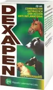 USO TERAPEUTICO: Antimicrobiano PRINCIPIO ACTIVO:Penicilina procainica, penicilina potásica, estreptomicina, dexametasona. ESPECIES: DOSIS: BOVINOS, EQUINOS, CAPRINOS, OVINOS Y PORCINOS: Aplicar 5 ml por cada 100 kilos de peso vivo. CANINOS: Aplicar 1-2 ml por cada 5 KPV.. PRESENTACION: Dexapen, frasco por 20 ml.