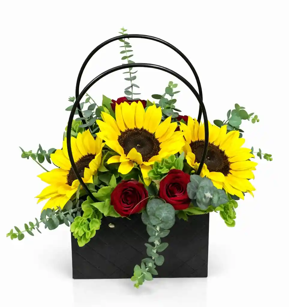 Cartera negra 3 girasoles 4 rosas y follajes Celebra el Día de la Mujer en Bogotá con un hermoso arreglo de girasoles y rosas en elegante cartera negra. Flores naturales frescas, perfectas para sorprender y expresar admiración.