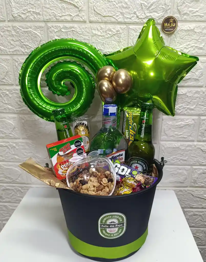 Ancheta dia del padre maravilloso con 1 Media de aguardiente 2 Cervezas importadas 1 chcolates ferrero x3 bombones 1 Wafer jet 1 Minigol 1 Gomita en forma de pizza 2 chocolates burbuja relleno de arequipe 1 Contenedor de frutos secos en forma de manzana 1 Balde hielero grande Padres felices!