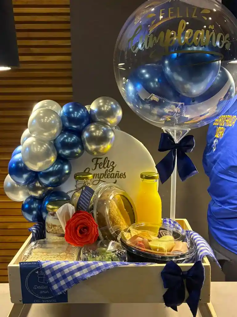 Bandeja decorada Arco en globos Globo burbuja Mini tabla de quesos Fruta Snack de sal Dos bebidas Parfait Postre Tarjeta personalizada Sorprende a ese hombre especial con un detalle hecho a su medida. Déjanos tu mensaje para hacer realidad esta sorpresa
