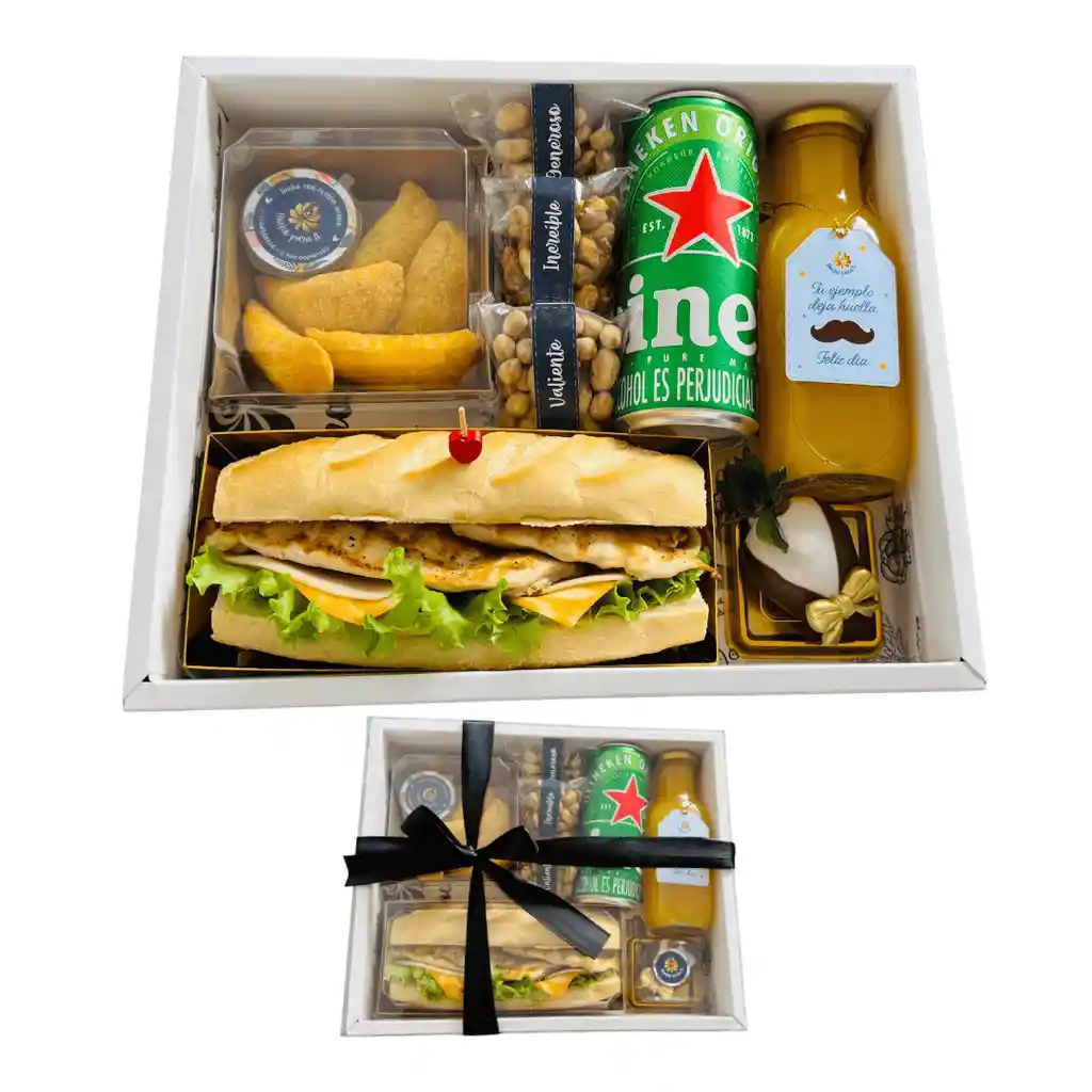 Un desayuno sorpresa ideal para celebrar el Día del Hombre, con una combinación de sabores intensos y una presentación moderna 🍊🍺. Incluye jugo de naranja 250 ml, cerveza fría, un delicioso sándwich de pechuga de pollo en pan baguette, snacks, empanaditas, y una divertida fresa para él 🍓 que le da un toque dulce a la sorpresa. Todo viene presentado en una caja de cartón con tapa en acetato, con cubiertos ecológicos, creando un detalle perfecto para regalar y comenzar el día con energía. Si nos envías tu mensaje, te obsequiamos una tarjeta personalizada 💌.