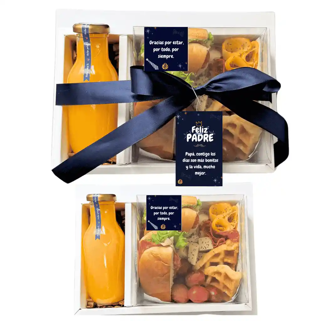 Desayuno sorpresa valiente: Una selección deliciosa y elegante para comenzar el día con sabor y estilo ✨. Incluye jugo de naranja 250 ml, waffles, mix de quesos y jamones, sándwich en pan árabe con salami, chorizo vela, jamón, queso, lechuga y salsa especial, uvas frescas y base en cartón con tapa de acetato. Si nos envías tu mensaje, te obsequiamos la tarjeta personalizada para expresar tus sentimientos de manera única 💌. REF: DES10