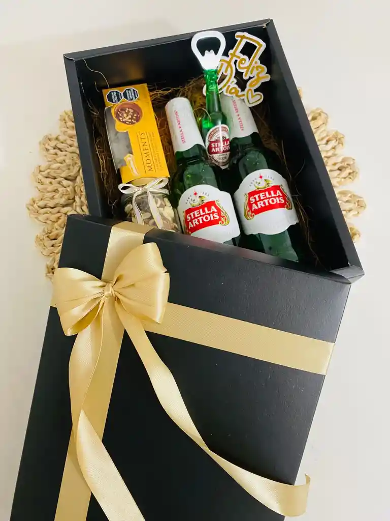 Linda Cajita con 2 Cervezas Stella Artois, Cajita de bombones de chocolate Moments, Destapador en forma de mini cerveza, Mix de Frutos secos, Masmelos y gomitas, Tarjeta Feliz día del Hombre.