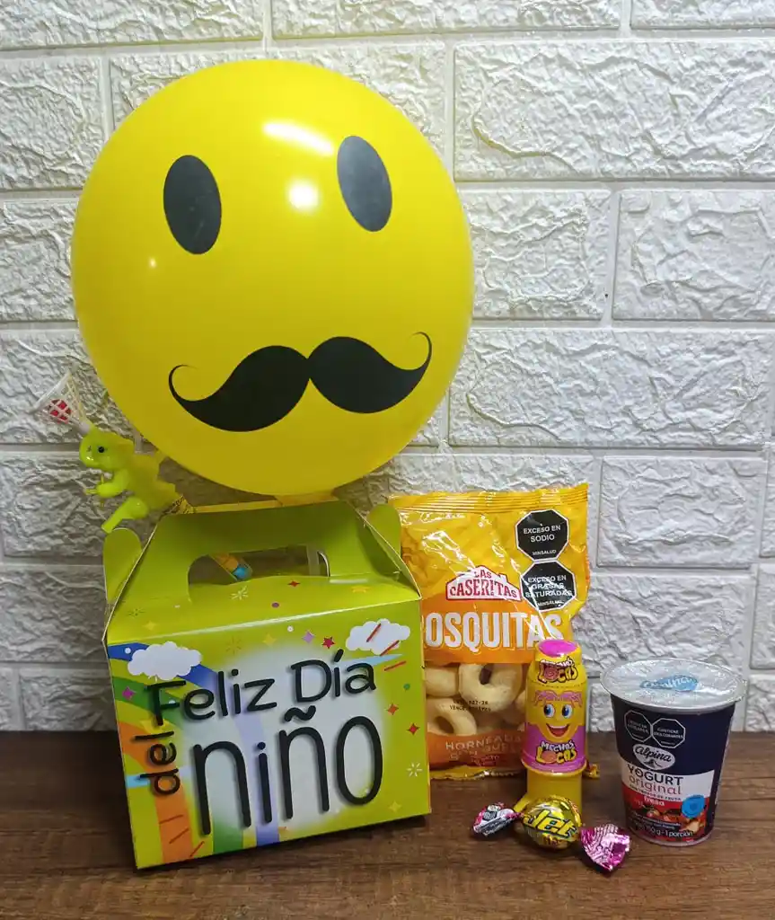 Caja de regalo "Feliz Día del Niño" con globo de emoji bigotón variado, snacks rosquitas y yogur chocolate burbuja, tarro animado mechas locas y silbato en forma de elefante con dulces. El kit perfecto para sorprender y celebrar a los pequeños en su día especial.