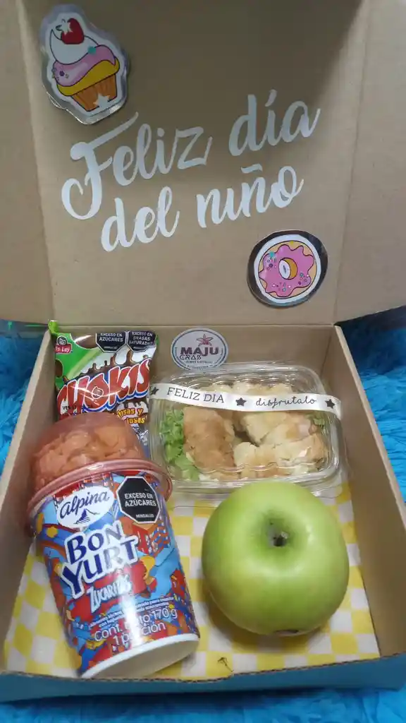 Desayuno para el dia del niño con mini croasan de jamon y queso bonyurt, fruta (según disponibilidad) chocolatina.