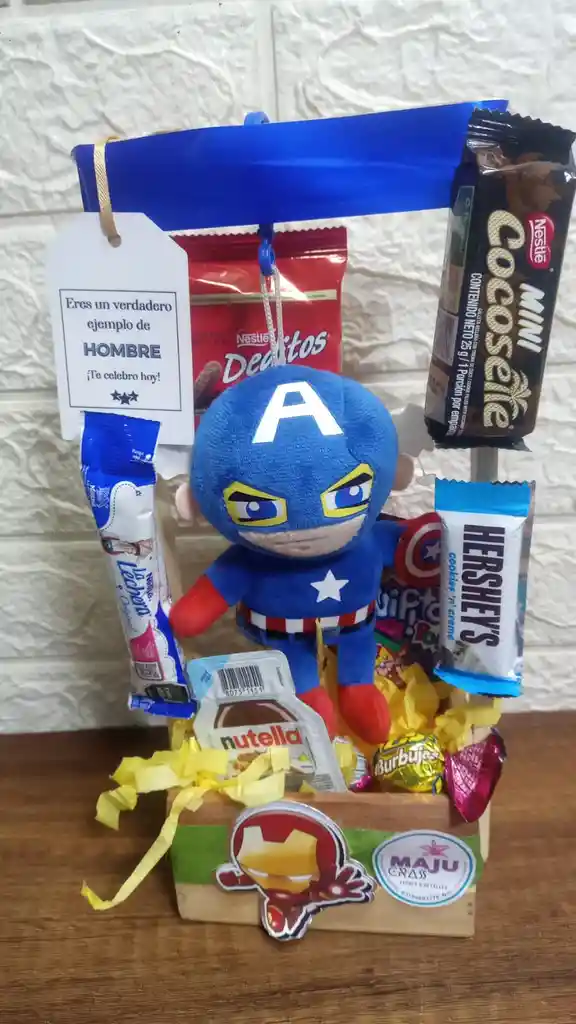 Ancheta dulcera del personaje aironman con: 1 Gomitas en paquete 1 dulces en forma de cerpiente 1 bebida de fruta marca COLANTA 1 masmelos en forma de cono 1 lecherita 1 Barra de gol 1 Nucita 1 Quipitos 1 Peluche llavero de aironman
