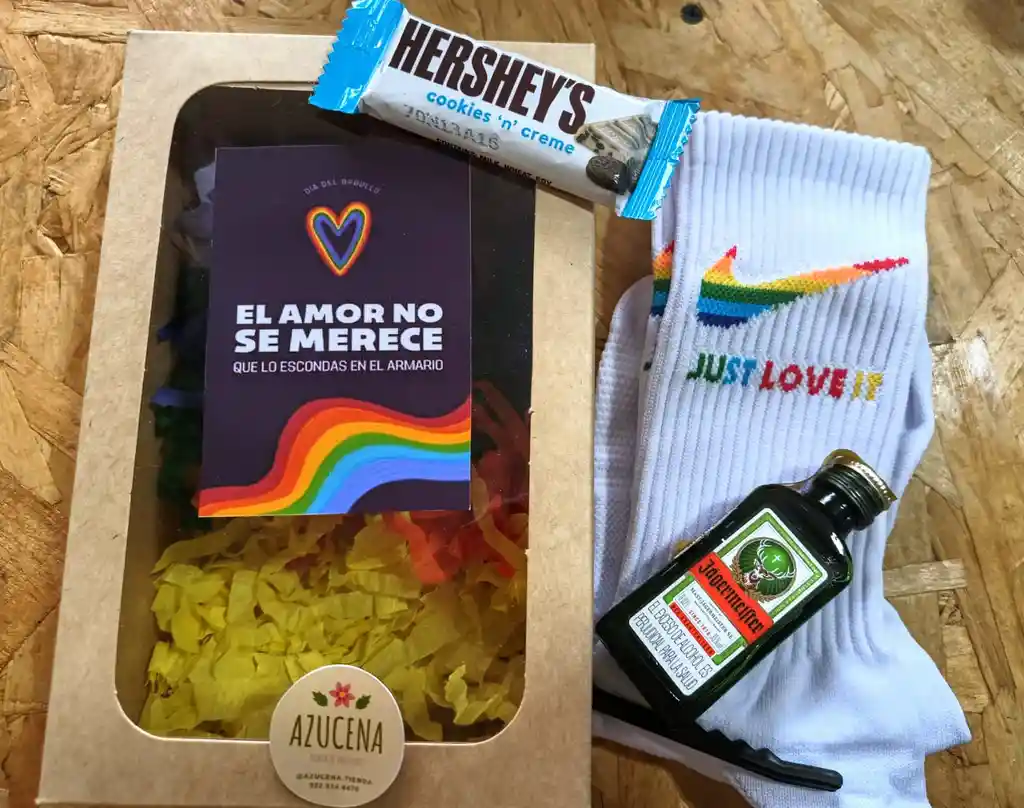 Cajita día del Orgullo #1 contiene, Medias temáticas, chocolatina Hershey´s, botellita de Jaguer y tarjeta. Ideal para celebrar día del orgullo aniversarios cumpleaños amor y amistad