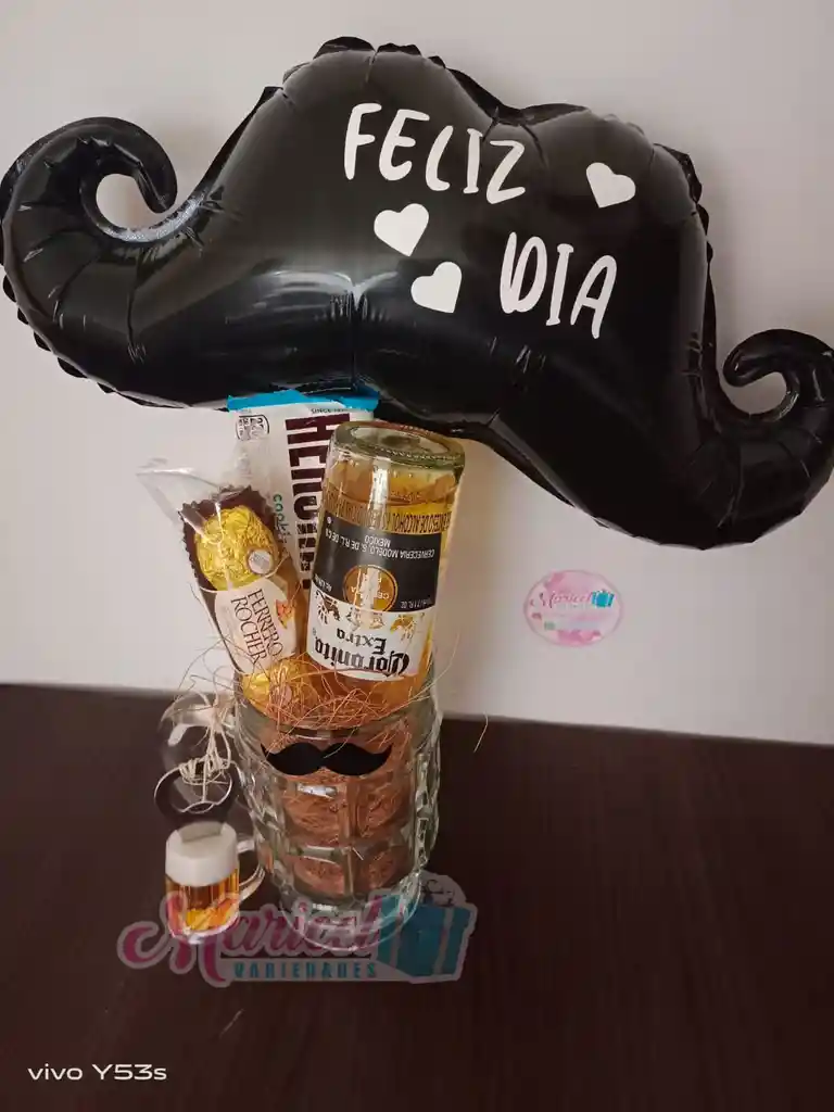 ELABORADO EN VASO CERVECERO DE VIDRIO, UNA CERVEZA CORONITA, UNA CHOCOLATINA HERSHEYS GRANDE, FERRERO ROCHER X3 UND Y UN DESTAPADOR, DECORADO CON GLOBO PERSONALIZADO en caso de agotarse algun producto sera reemplazado por uno de igual valor