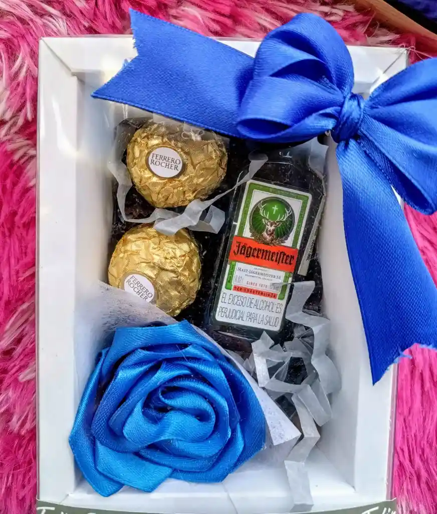 ANcheta feliz día del hombre, contiene caja de acetado y cartón decorada, botellita de Jägermeister, rosa eterna y dos chocolates ferrero.