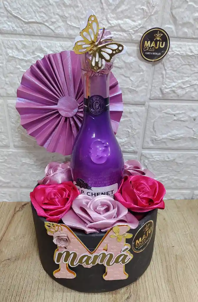 Contenedor fino con rosa eterna y champaña JP. (Si desea el detalle con flores naturales indicar en el chat del pedido, de lo contrario se enviara con rosa eterna).