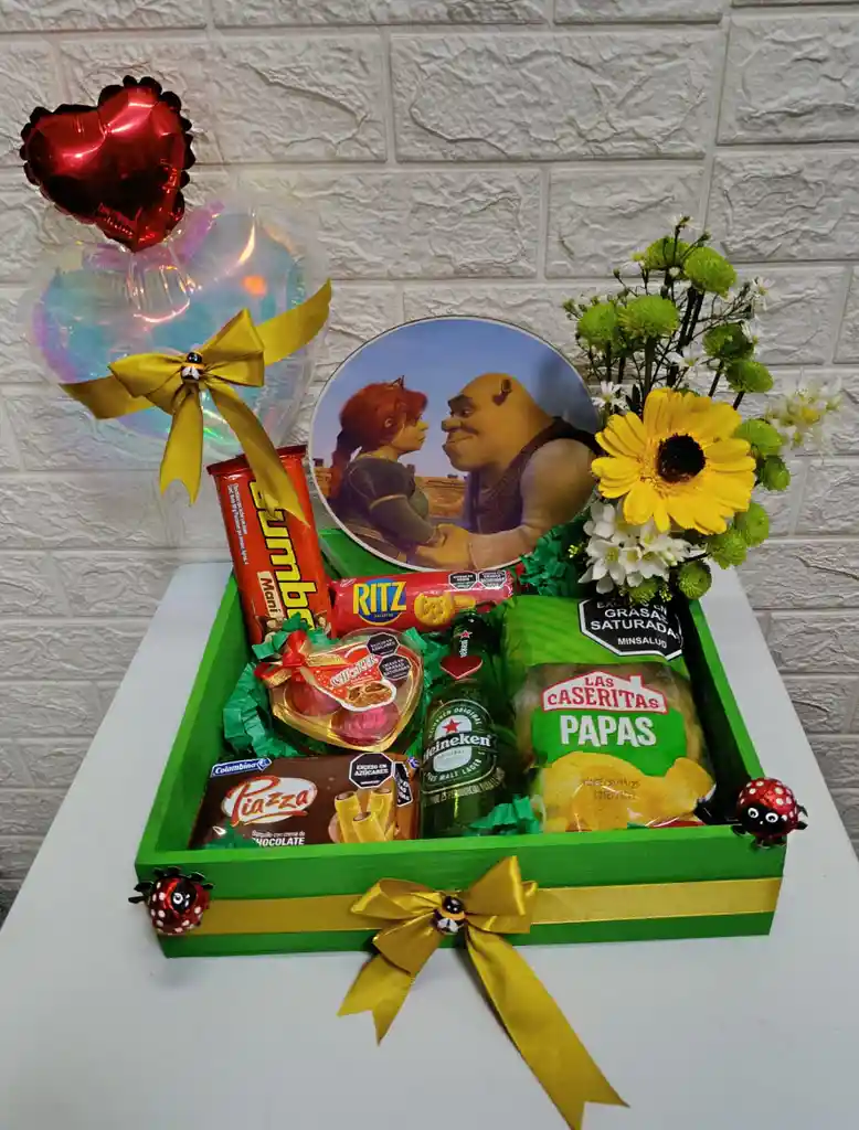 Características* - Caja de madera artesanal decorada en verde - Fondo decorativo con Shrek y Fiona - Dos globos de corazón (rojo y transparente iridiscente) - Arreglo floral con girasol -Mariquitas en chocolate - Botella de cerveza Heineken - Variedad de snacks: barra jumbo Maní grande, galletas Ritz, papas Las Caseritas, barquillos Piazza - Chocolates en caja con forma de corazón - Lazo dorado y detalles de mariquitas