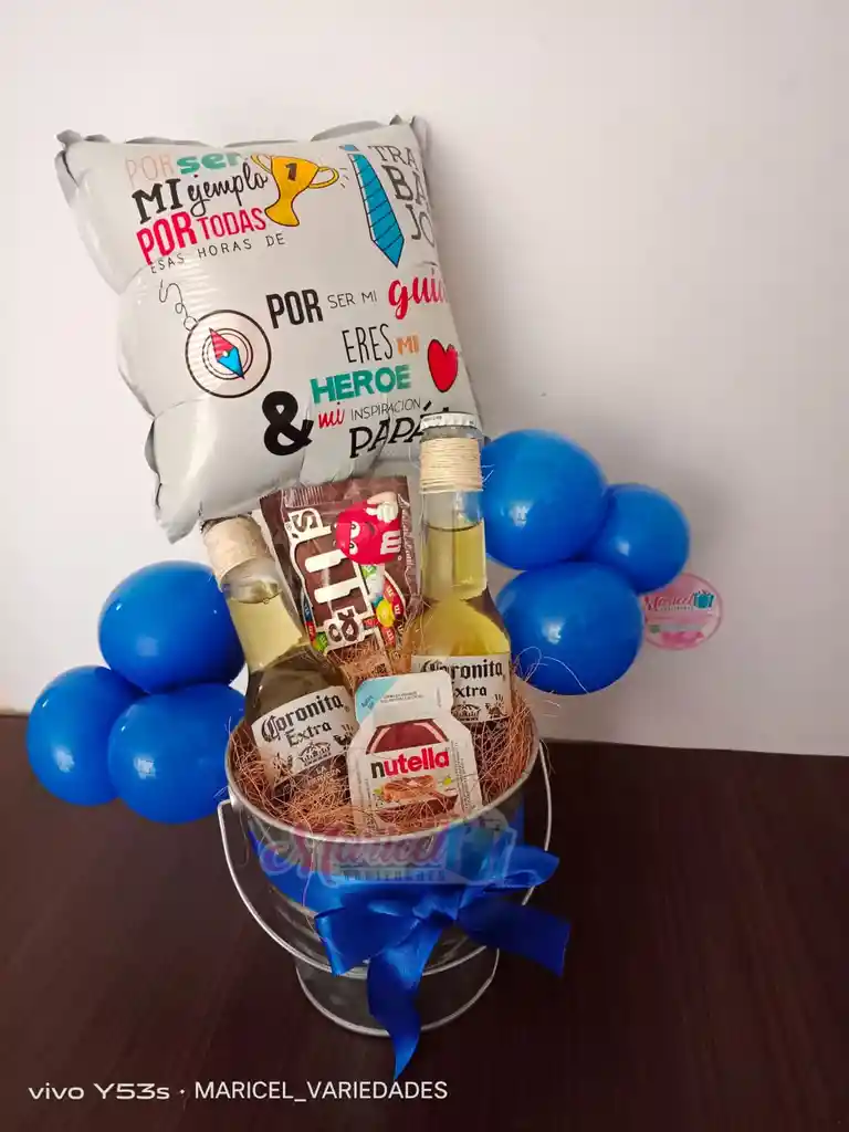 ELABORADO EN HIELERA METALICA MEDIANA, DOS CERVEZAS CORONITAS, UN SOBRE DE NUTELLA, UN CHOCOLATE AMERICANO M&M, DECORADO CON GLOBOS METALIZADOS, CINTAS DECORATIVASNY TARJETA