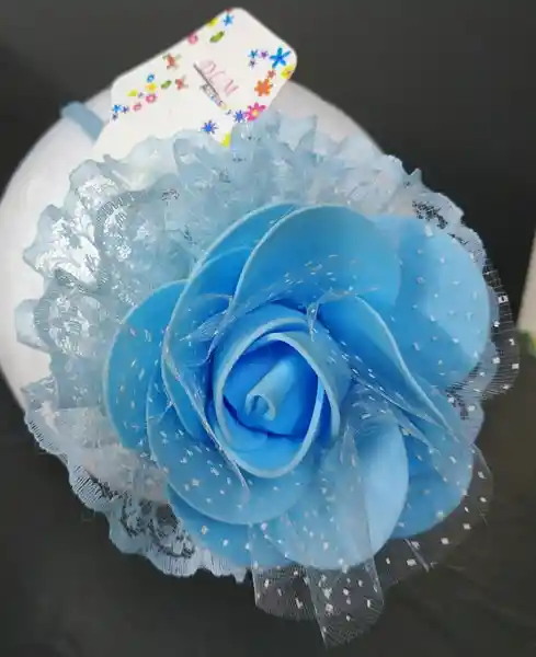 Diadema metálica con hermosa flor azul.