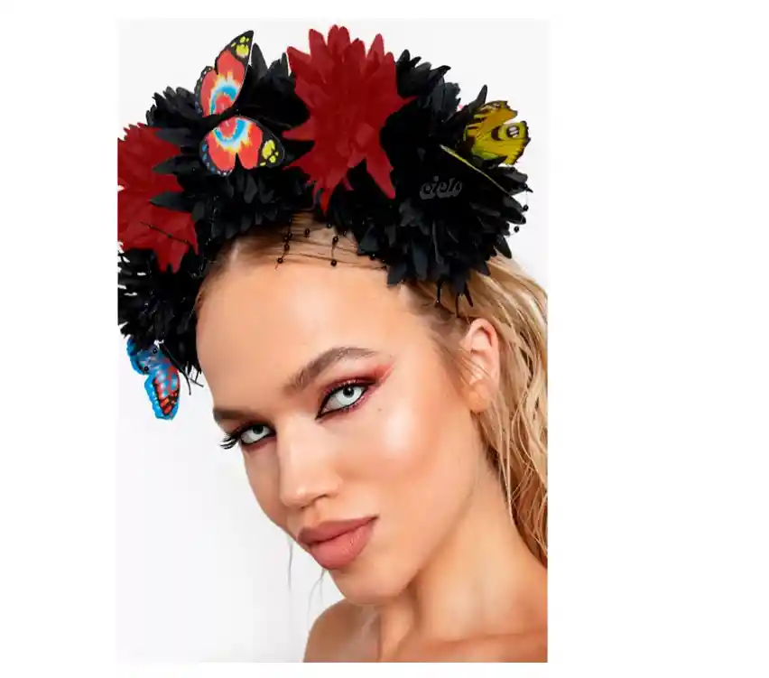Increíble diadema con flores y mariposas para disfraz de Catrina, Frida, Carnaval, entre otros. Flores en tela con hermosas mariposas y diadema suave que se adapta al tamaño de la cabeza. Accesorio ideal para Halloween fiestas, etc. Medidas: 20 cm x 20 cm