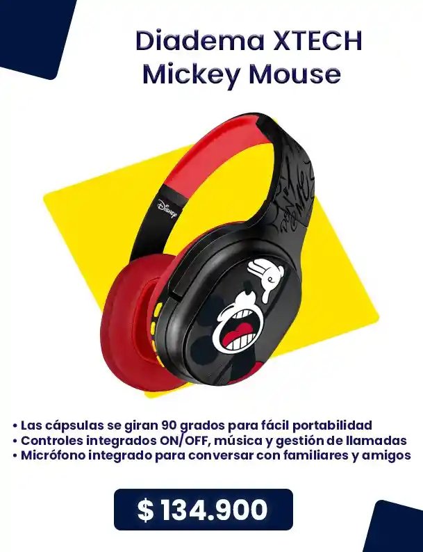 Características principales Las cápsulas se giran 90 grados para fácil portabilidad Controles integrados ON/OFF, música y gestión de llamadas Micrófono integrado para conversar con familiares y amigos Acerca de este producto Los Audífonos en Diadema Xtech colección Disney Mickey Mouse, cuentan con botones para controlar el encendido y apagado, gestionar la música y las llamadas, además se pueden conectar de manera inalámbrica con alcance máximo es de 10 m. Su batería se carga en tan solo 1.30 Horas y permitirá disfrutar de hasta 8 horas de reproducción. Sus micros parlantes de 40mm brindan un sonido detallado y natural, adicional tienen entrada auxiliar para conectar los audífonos a un dispositivo y continuar escuchando música. ¡Lleva el tuyo ahora!