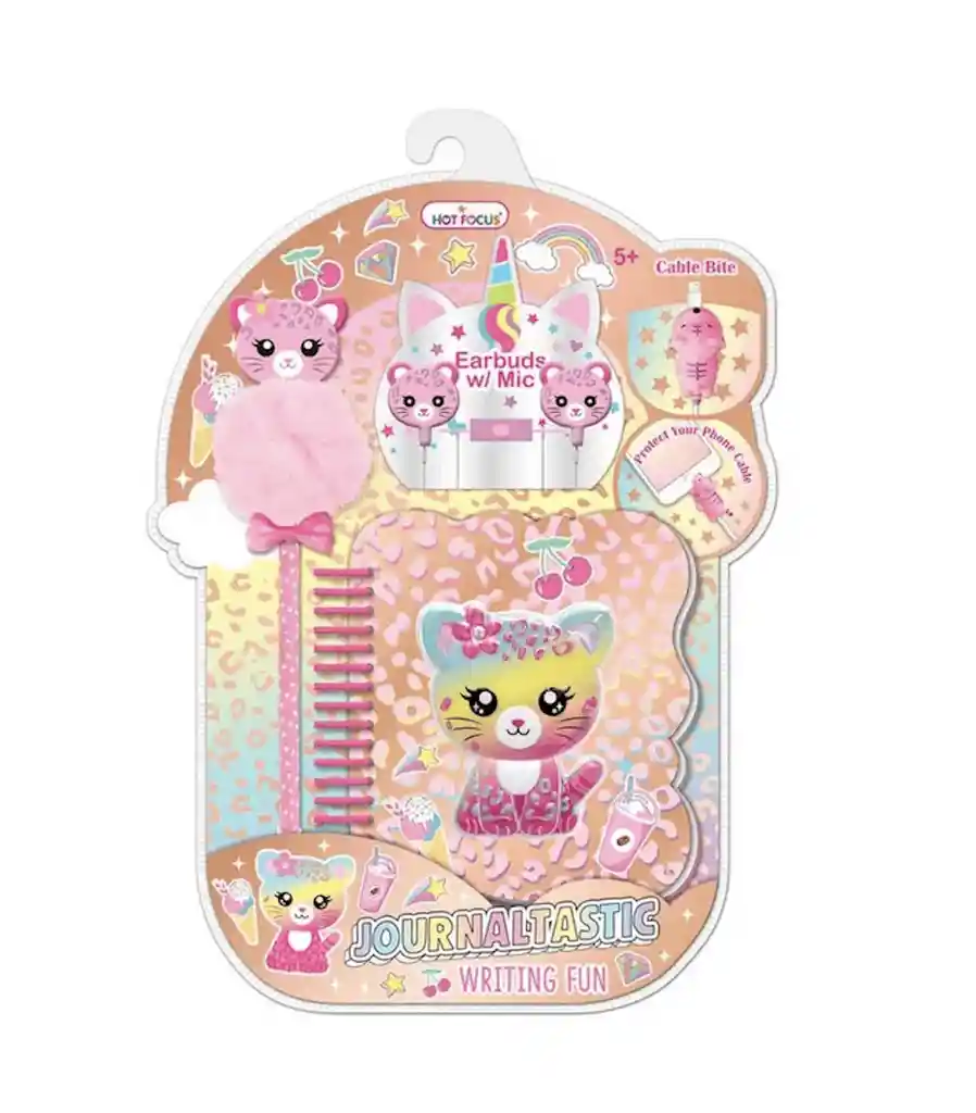 Este hermoso y único diario incluye: Hermosos originales auriculares en forma de leopardo Bolígrafo con pom pom Una original libreta y una pinza para que el cable de los auriculares se sujete bien al teléfono.