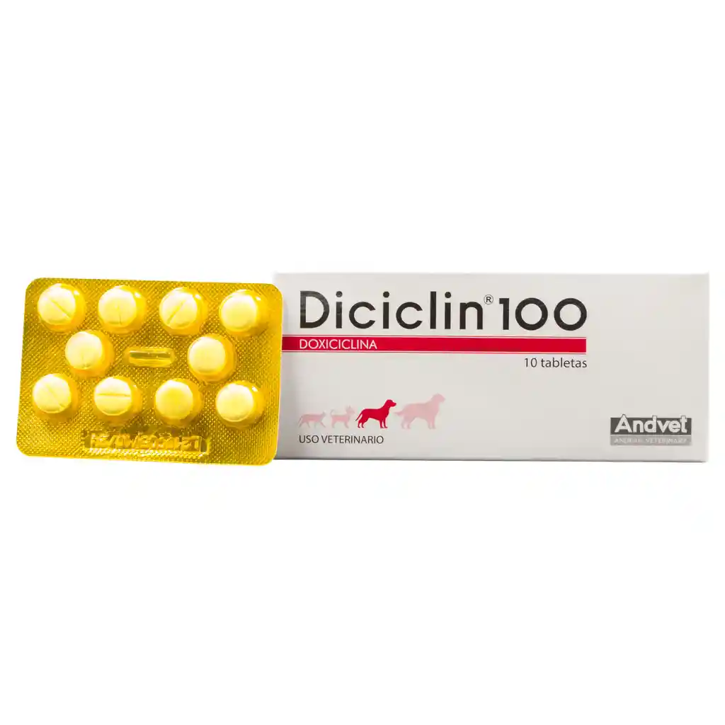 DICICLIN 100 es un medicamento veterinario en forma de tabletas, cada una con 100 mg de doxiciclina, un antibiótico de amplio espectro. Se presenta en cajas de 10 tabletas, facilitando su administración en tratamientos de corta duración.