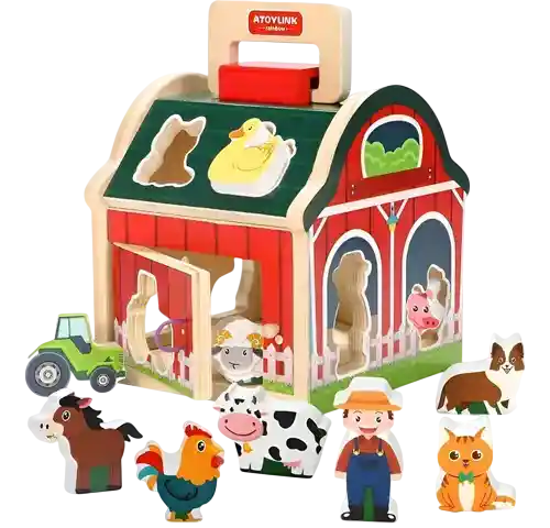 Exclusivo Juguete Encaje de Madera " Granja de Animales" - Juguetes de granja de madera: nuestro juego de granja de madera mejorado es un granero de madera portátil que viene con piezas de juego adicionales, incluyendo animales de granja, agricultores, etc. - El mango de madera hace que sea fácil de transportar. - Juguete clasificador de formas: la casa de granja de madera tiene varias entradas con forma de animal y solo pueden entrar los animales correspondientes. Los niños pequeños pueden jugar diversión reconociendo diferentes formas y clasificándolos, también hay una puerta conveniente para que los niños pongan los bloques de madera dentro y fuera, añadiendo diversión para que los niños jueguen. - Juguetes y regalos educativos: nuestro juguete clasificador de formas de animales de granja está desarrollado para proporcionar una manera entretenida para que los niños pequeños se diviertan sin fin mientras mejoran el reconocimiento de formas, habilidades motoras finas, coordinación ojo-mano y habilidades de resolución de problemas.