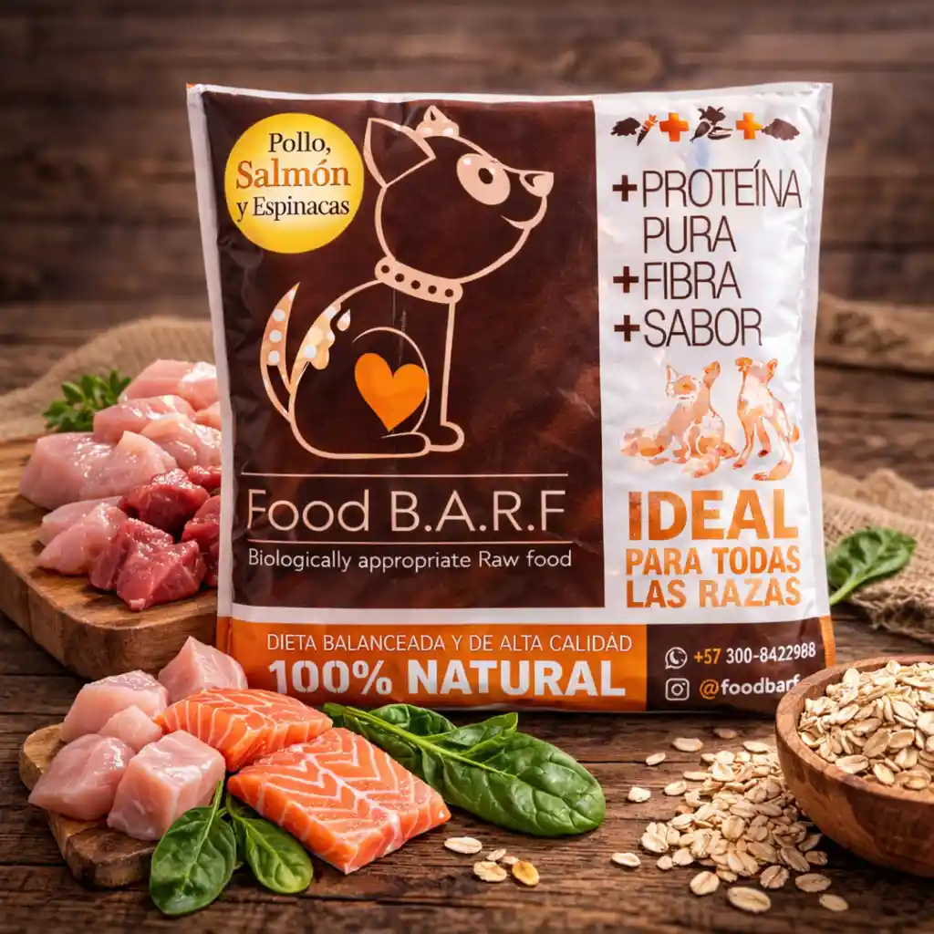 Food B.A.R.F Alimento Para Perro Dieta Pollo, Salmón y Espinacas 600 g ¡Salmón, pollo y espinacas: una combinación perfecta para tu perro en dieta BARF! Nuestra mezcla de salmón, pollo y espinacas está diseñada para proporcionar a tu peludo una nutrición completa y saludable, con múltiples beneficios: Salmón: Rico en ácidos grasos Omega-3, ayuda a mantener el pelaje brillante, la piel saludable y favorece la salud cardiovascular. Pollo: Proteína magra y fácil de digerir, ideal para perros activos y con necesidades de energía. Espinacas: Fuente de vitaminas A, C y K, que refuerzan el sistema inmunológico y promueven una buena digestión. ¡Dale a tu perro lo mejor de la naturaleza con ingredientes frescos y nutritivos que lo mantendrán saludable y lleno de energía!