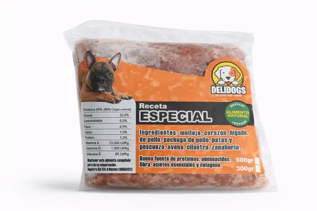 🫀 Especial (pollo + vísceras) Ingredientes: Molleja, corazón e hígado de pollo, pechuga, patas y pescuezo, avena, verduras y aceite de oliva. Beneficios: * Más hierro y minerales * Apoya masa muscular y vitalidad * Ideal para perros activos