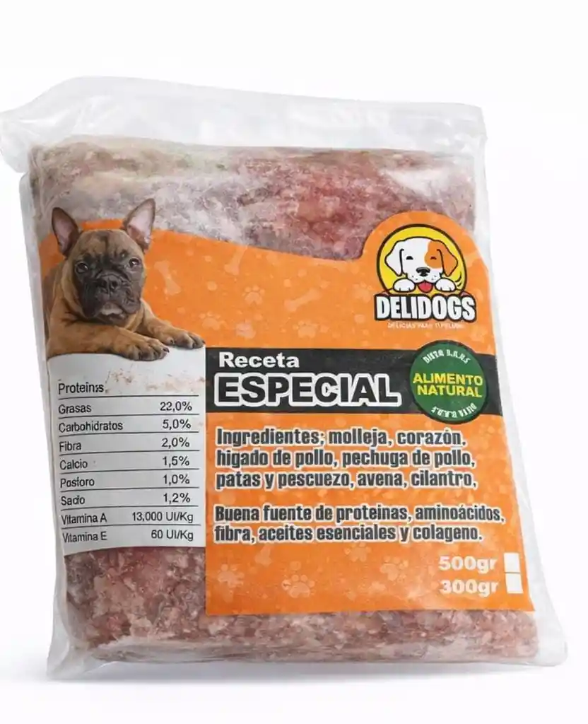 🫀 Especial (pollo + vísceras) Ingredientes: Molleja, corazón e hígado de pollo, pechuga, patas y pescuezo, avena, verduras y aceite de oliva. Beneficios: * Más hierro y minerales * Apoya masa muscular y vitalidad * Ideal para perros activos