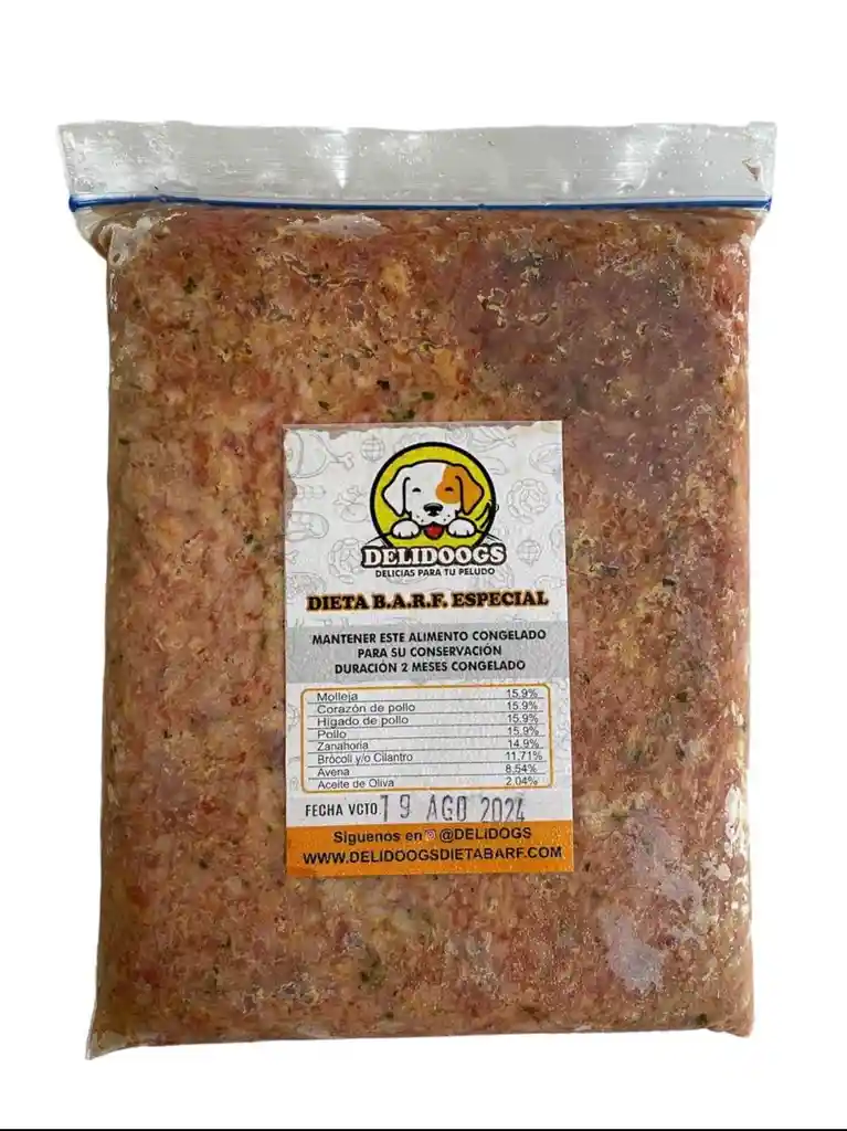 Ingredientes: Molleja, corazon, higado de pollo, pechuga de pollo, patas pescuezo, avena, cilantro,zanahoria. Buena fuente de proteinas, aminoacidos,fibra, aceites esenciales y colageno.
